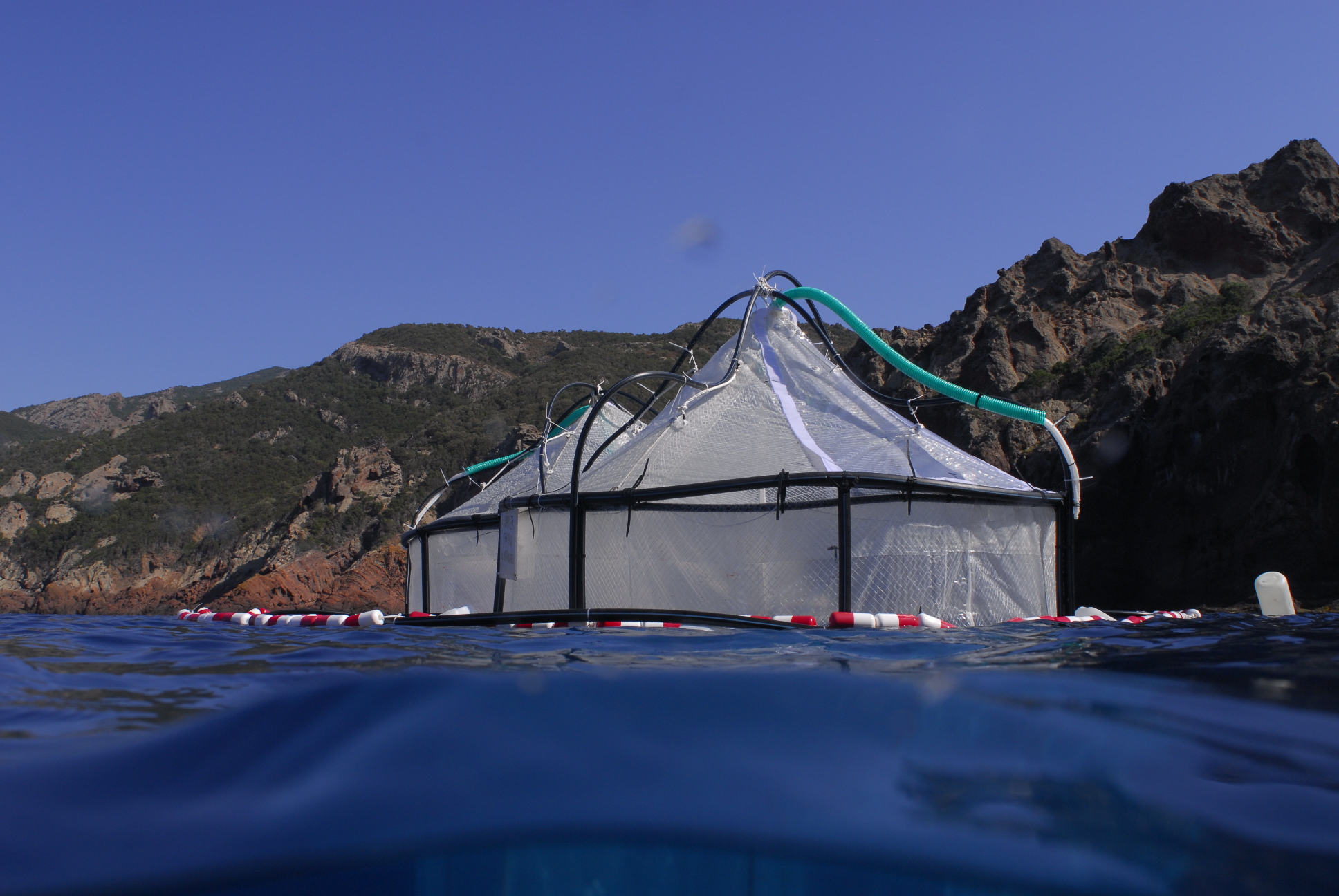 | Description | : | Deux mésocosmes vus de la surface pendant la phase pilote en juillet 2007. L'échantillonnage à 3 profondeurs différentes (subsurface, 5 mètres et 10 mètres) se fait par pompage par l'extérieur sans aucune perturbation de l'intérieur du sac. Un piège à particule est placé à l'extrémité du sac à 14 mètres de la surface. |