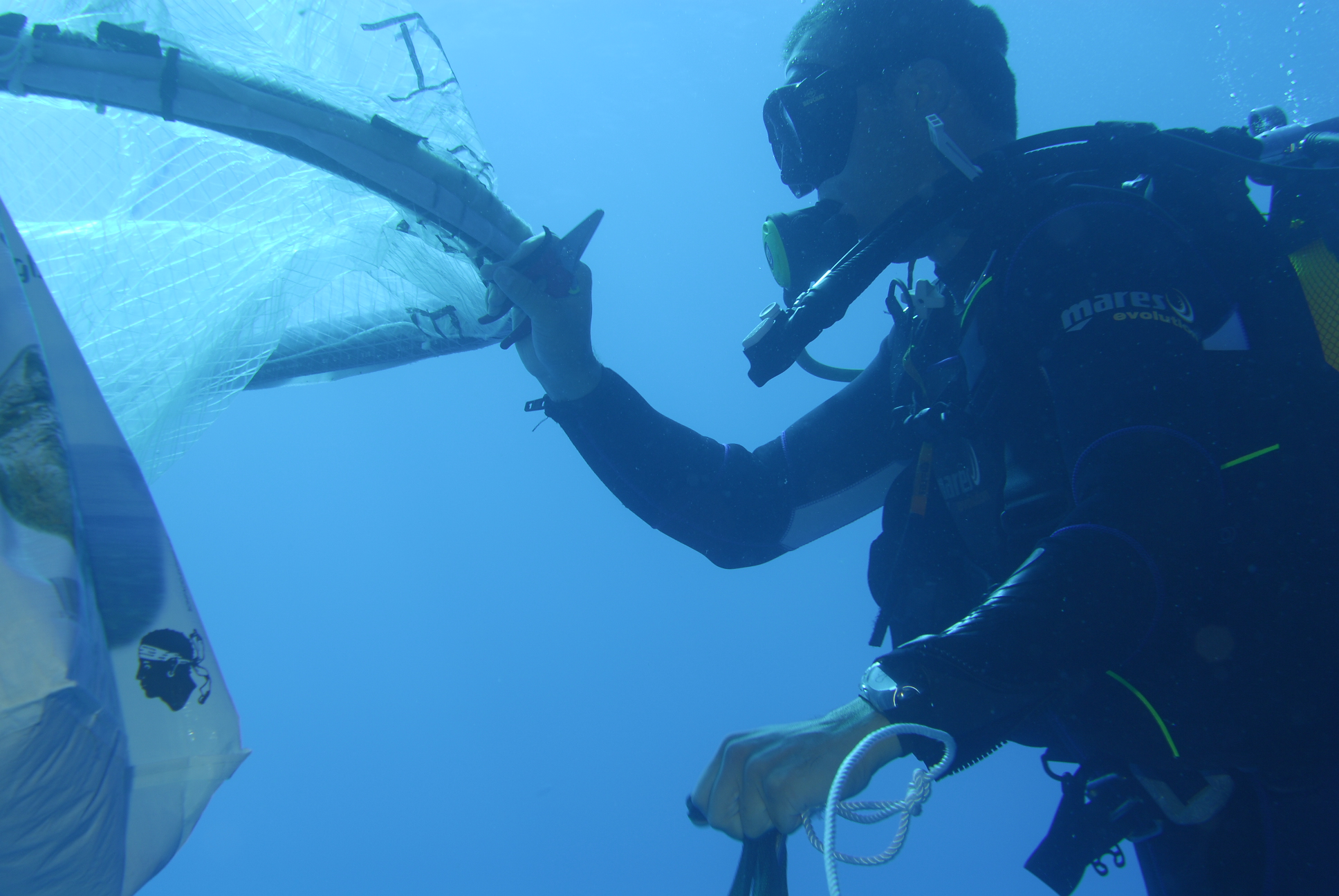 | Description | : | Deux mésocosmes vus de la surface pendant la phase pilote en juillet 2007. L'échantillonnage à 3 profondeurs différentes (subsurface, 5 mètres et 10 mètres) se fait par pompage par l'extérieur sans aucune perturbation de l'intérieur du sac. Un piège à particule est placé à l'extrémité du sac à 14 mètres de la surface. |